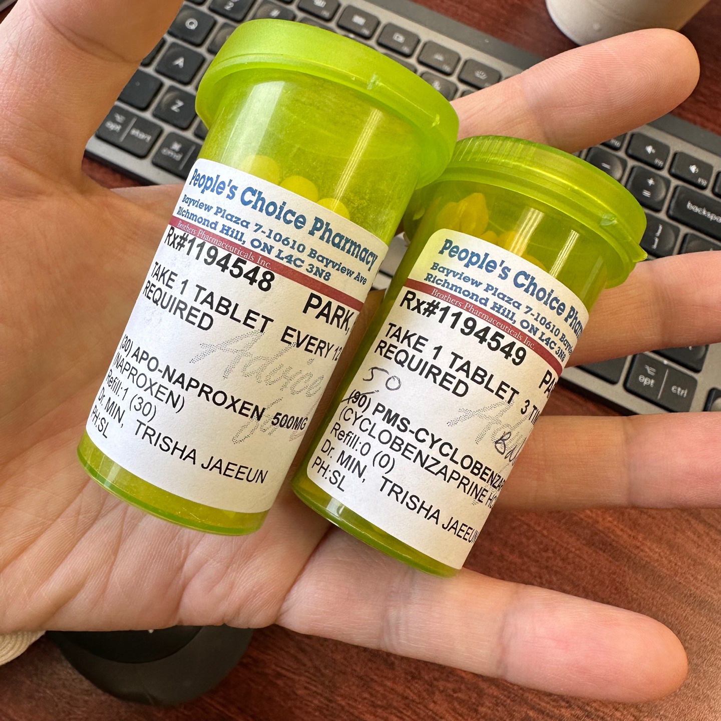 유튜브에 검색해서 이런저런 비디오도 보고, 한국에 유명한 의사분이 설명하시는 영상들도 찾아보고나니, 아무래도 약을 처방받아야겠다 싶었다. 월요일 되자마자 패밀리닥터한테 전화해서 이런저런 설명을하고 총 2개의 약을 처방받았다. 소염진통제와 근육 이완제.