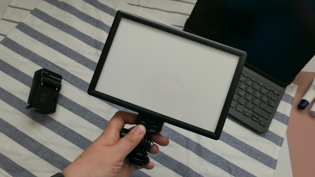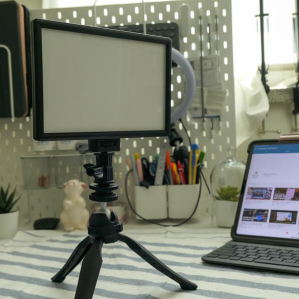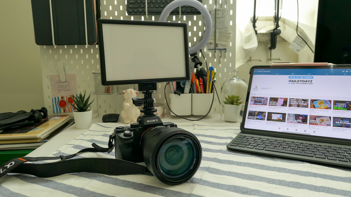 제 영상들은 보통 책상위에서 촬영을 하기 때문에, 전체적인 방의 조명도 당연히 중요하지만, 아이패드 가까이에서 밝게 빛을 쏴줄 조명이 필요하거든요. 기존에 가지고있던 링 타입의 조명은 이상하게 눈이 너무 피곤하더라구요. 어차피 카메라에도 장착해서 사용할 조명을 구입하자! 해서 구입한 유튜브 촬영용 LED 조명입니다.