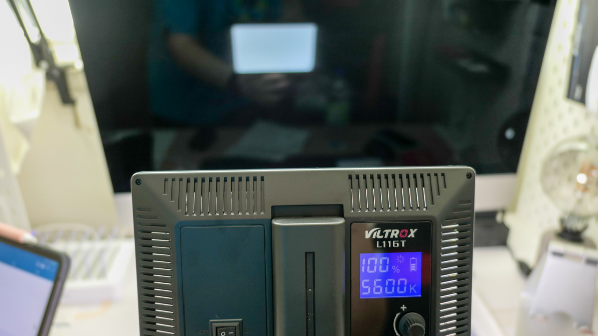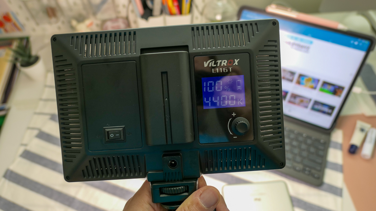 배터리를 판넬에 꽂아주고, 왼쪽의 ON/OFF 버튼으로 일단 조명을 켜주면, 오른쪽 숫자 계기판(?)에 밝기와, 남은 배터리양과, 조명의 온도를 보여주고있어요. 위의 사진상 보이는 52%는 조명의 밝기를 말하는 건데, 아래쪽 +- 다이얼을 돌려서 100에 가까이 할 수록 밝은 조명이 되고, 퍼센테이지 숫자가 낮아질수록 밝기가 약해집니다.