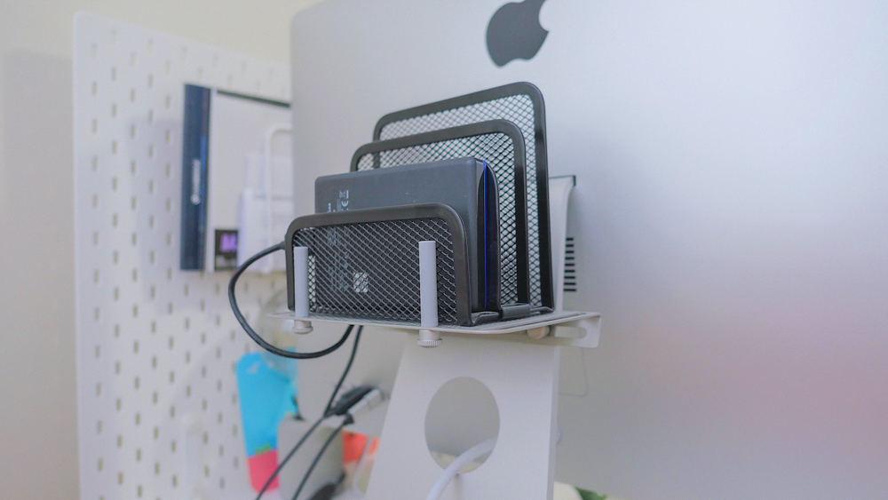 포터블 외장하드 2개를 아이맥에 꽂아놓은 상태로 사용중인데(HD 2테라 짜리 하나, SSD 1테라 짜리 하나) 아이맥 옆 구석에 냅킨꽂이 같이 생긴거에다가 나름 깔끔하게 정리한다고 해놓고 사용하고 있었습니다.