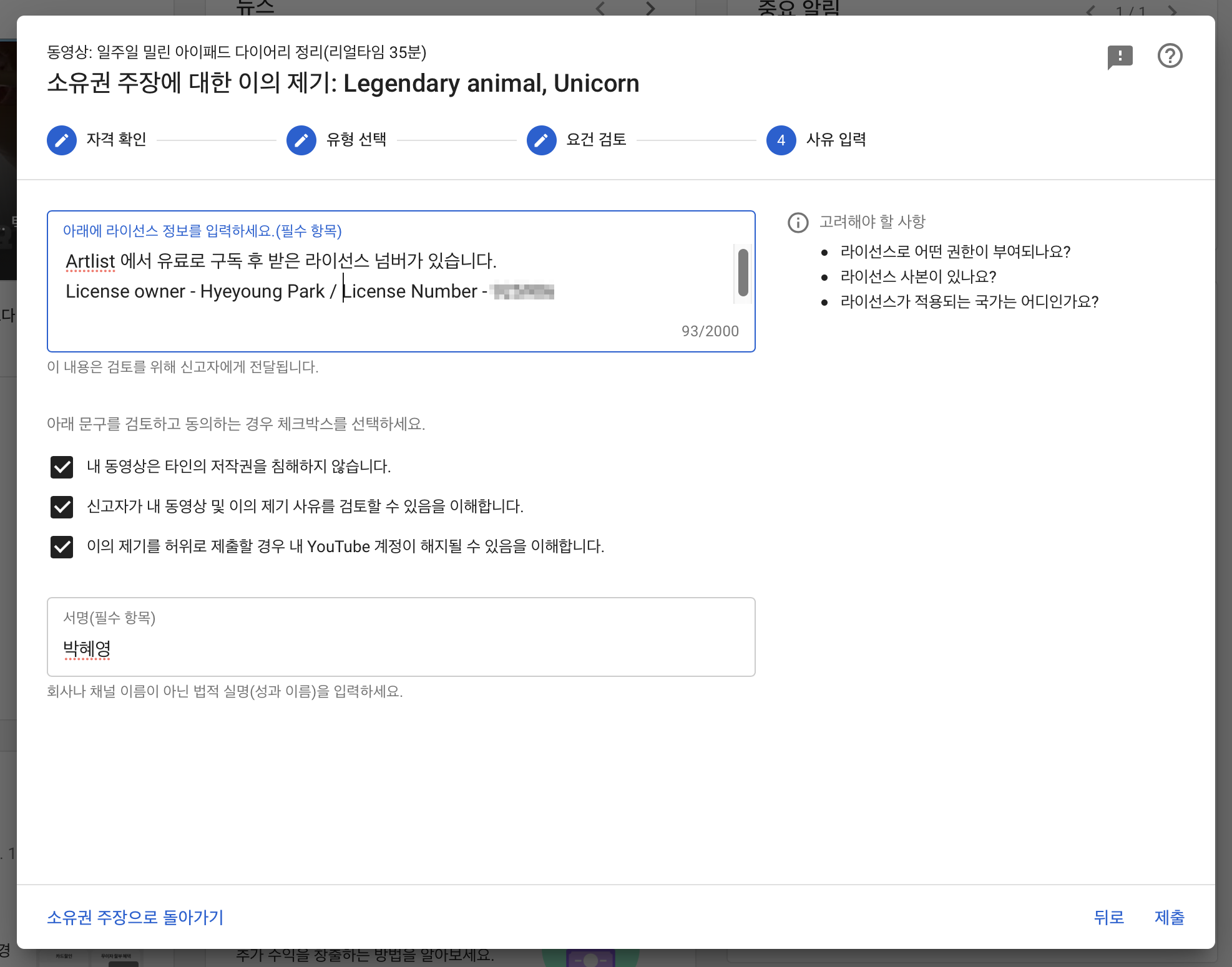 저의 경우에는 위에 정보 입력에 저런식으로 제 이름과 아트리스트 라이선스 넘버를 적어서 서명을 한 후 제출을 합니다. 라이선스 넘버는 아트리스트 결제하셨을 때 인보이스에도 적혀있고, 노래 받을 때 같이 날라오는 라이선스 PDF 에도 적혀 있으니 쉽게 찾으실 수 있어요.
