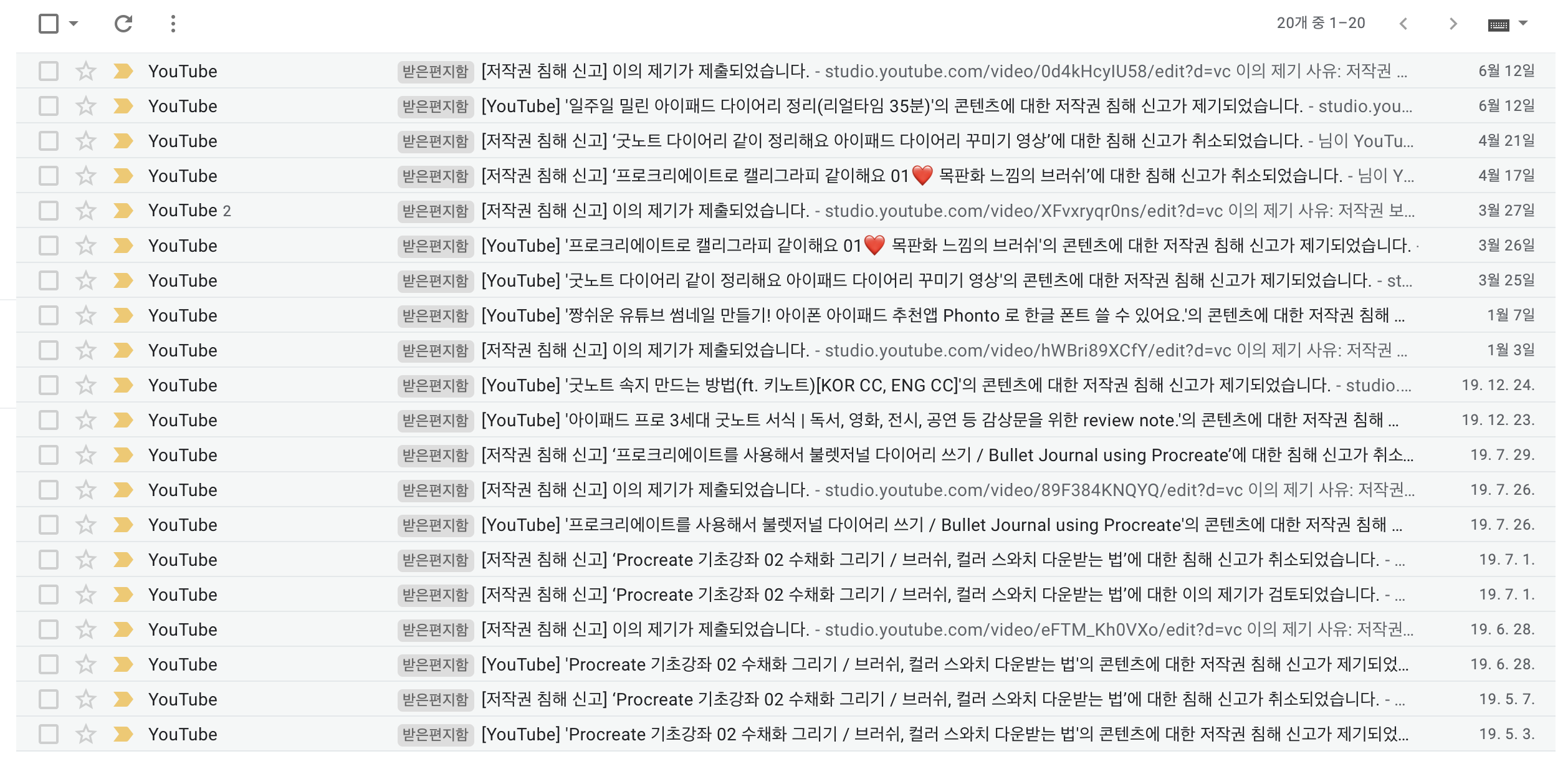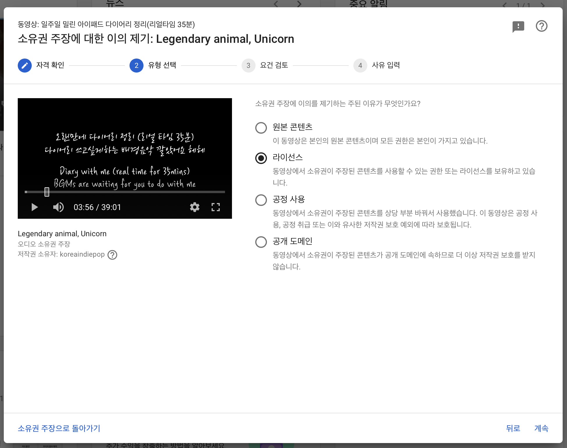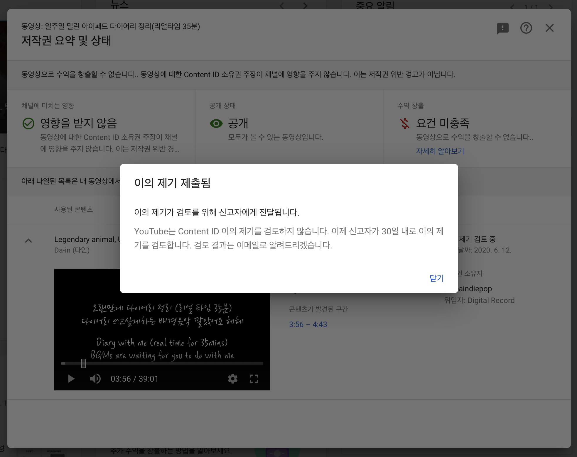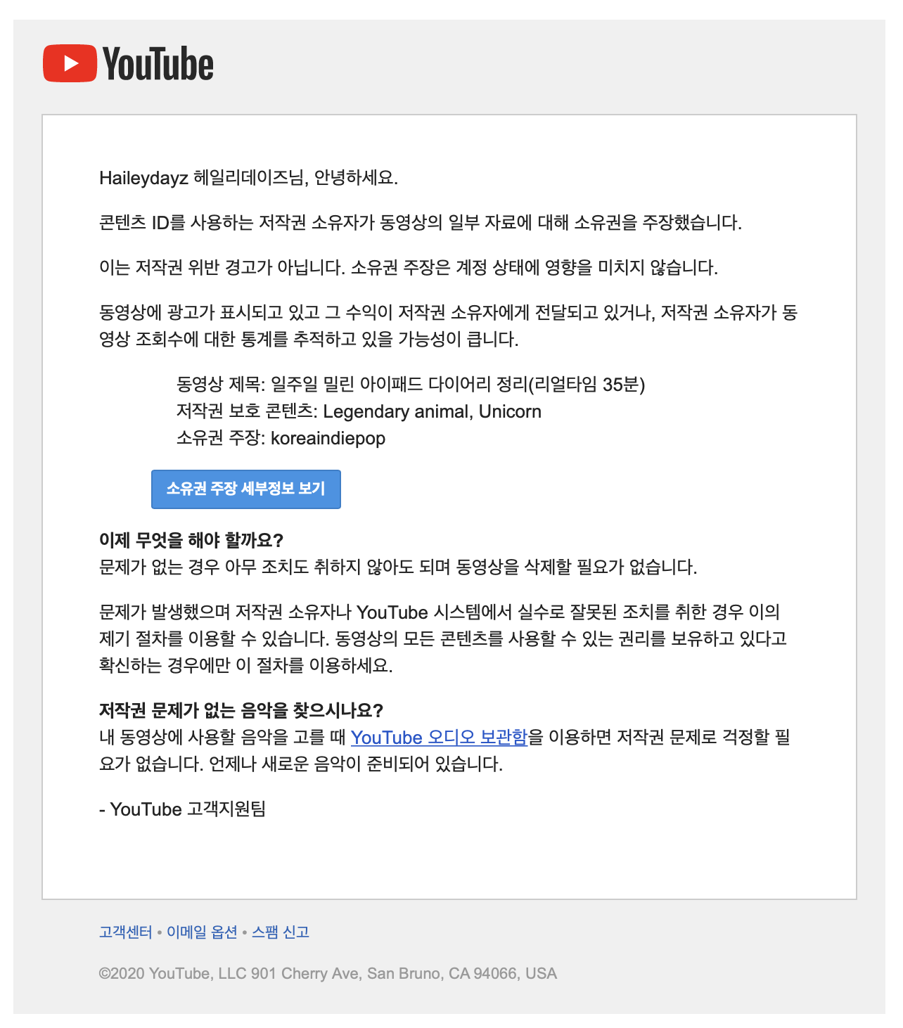 아무튼, 이제 저는 확실히 이의제기를 할 명분도 있고 2년동안 꽤 여러번 처리를 했었던 터라 이제는 당황스럽지도 않아요. 물론 유료로 돈내고 사용했던 음악인데도 신고가 오는게 가끔 귀찮기도하지만, 결과적으로 처리는 잘 되니까요.