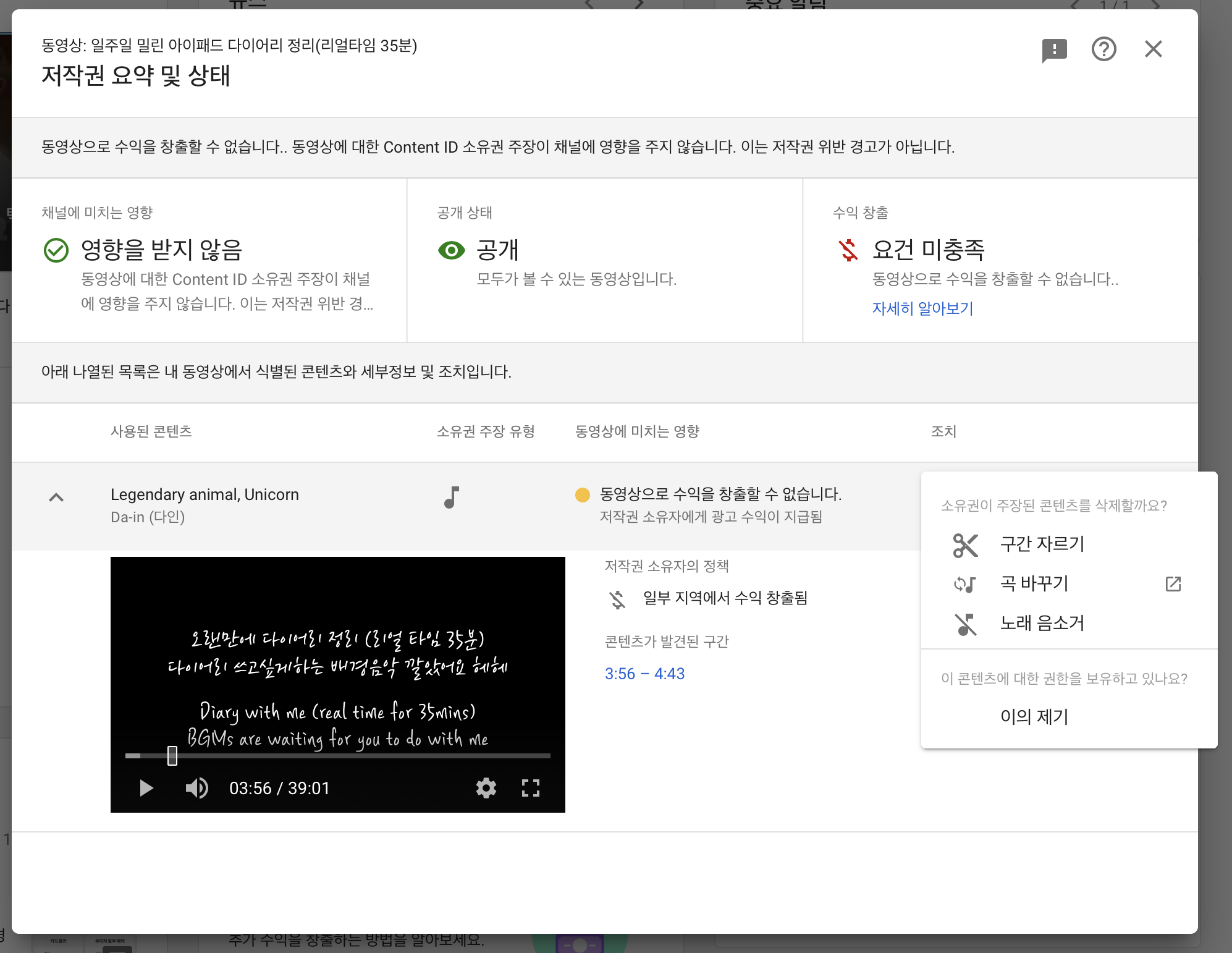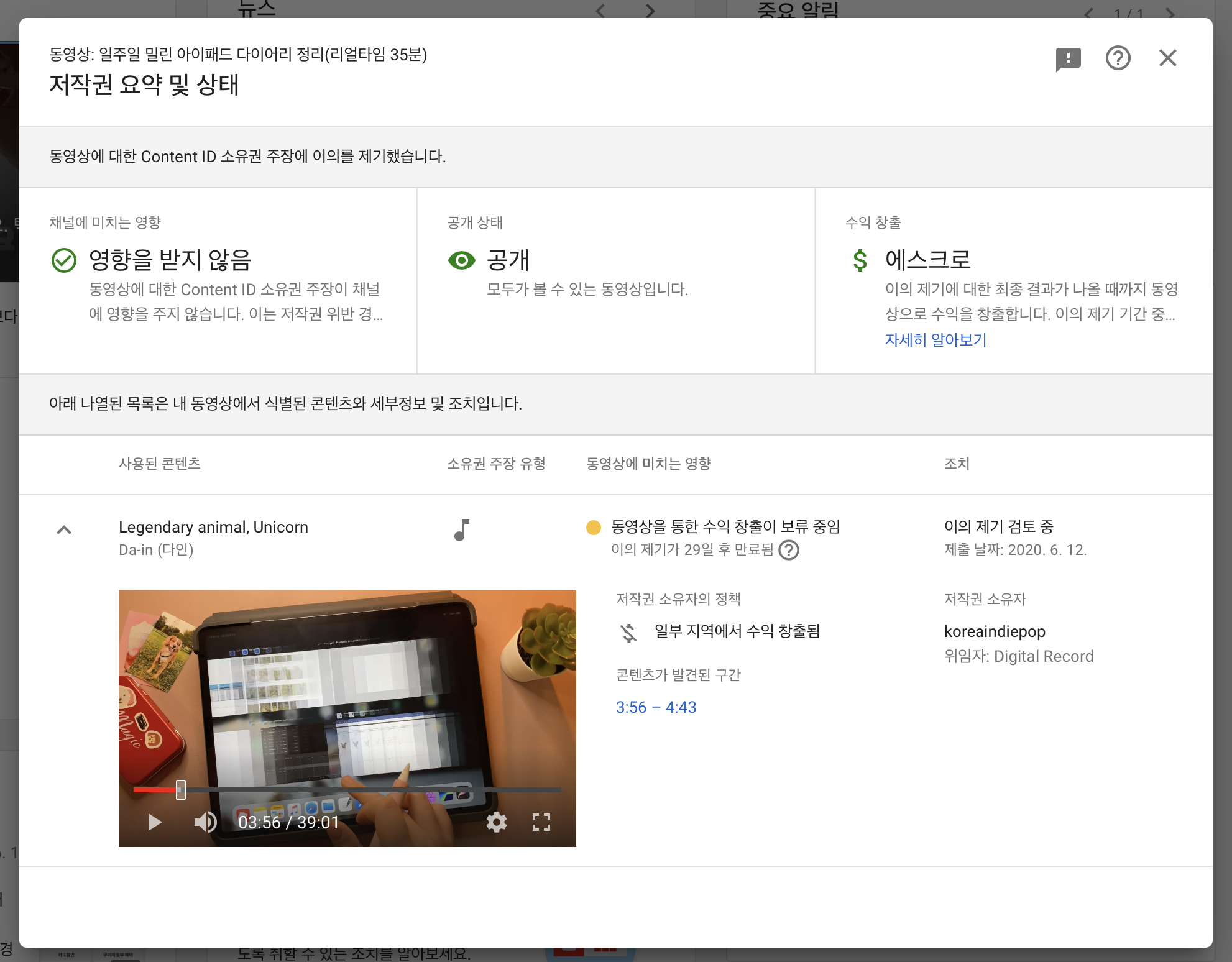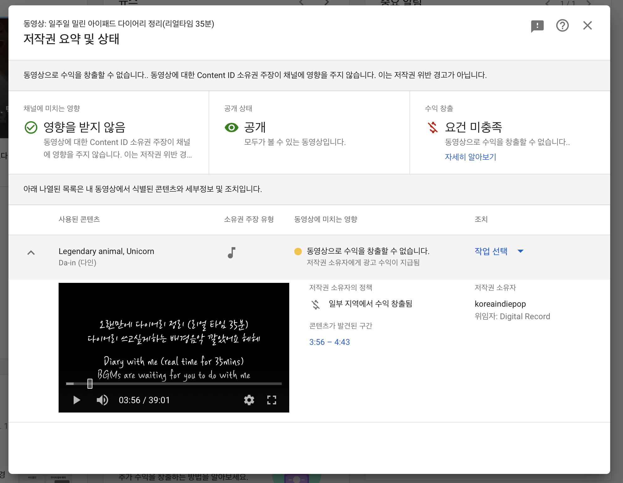 이번에는 특이하게 저작권 소유자가 Koreanindiepop 한국 인디음악이다니요...? 아무튼, 저작권 위반 경고는 아니고 일단 그쪽에서 소유권 주장을 제기를 한거니까요. 이의제기를 해봅시다. "수익창출에 요건 미충족" 이게 너무 보기싫거든요. 빨갛고 노란거도 보기싫자나요?