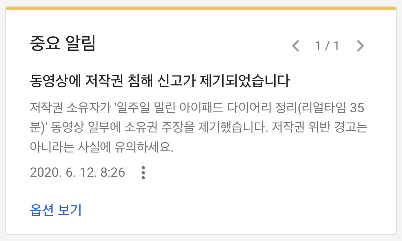 저작권 침해신고가 접수가 되면 유튜브 크리에이터 스튜디오에 아래 사진처럼 보기 싫은 노란 상자가 생깁니다. 노란상자 안의 [옵션 보기]를 클릭하면 영상의 어느 부분에 들어간 음악에 저작권 문제가 있는지 볼 수 있어요.