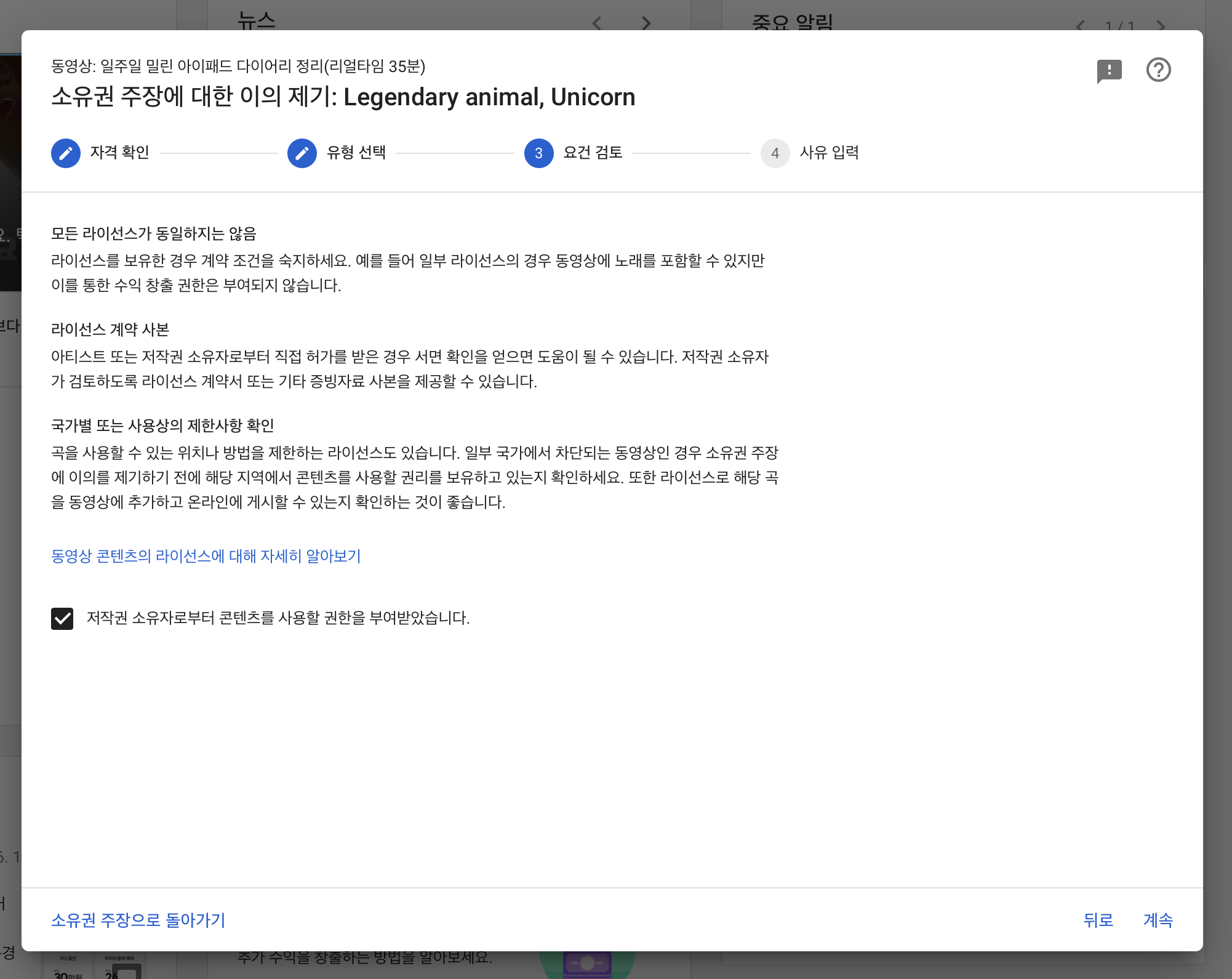 다음 화면에서 중앙에 보시면 "위의 사유 중 해당하는 이의 제기 사유가 없습니다. 그래도 이 Content ID 소유권 주장에 이의를 제기하겠습니다." 이거를 체크를 하시고 하단에 "계속" 버튼을 눌러주세요.