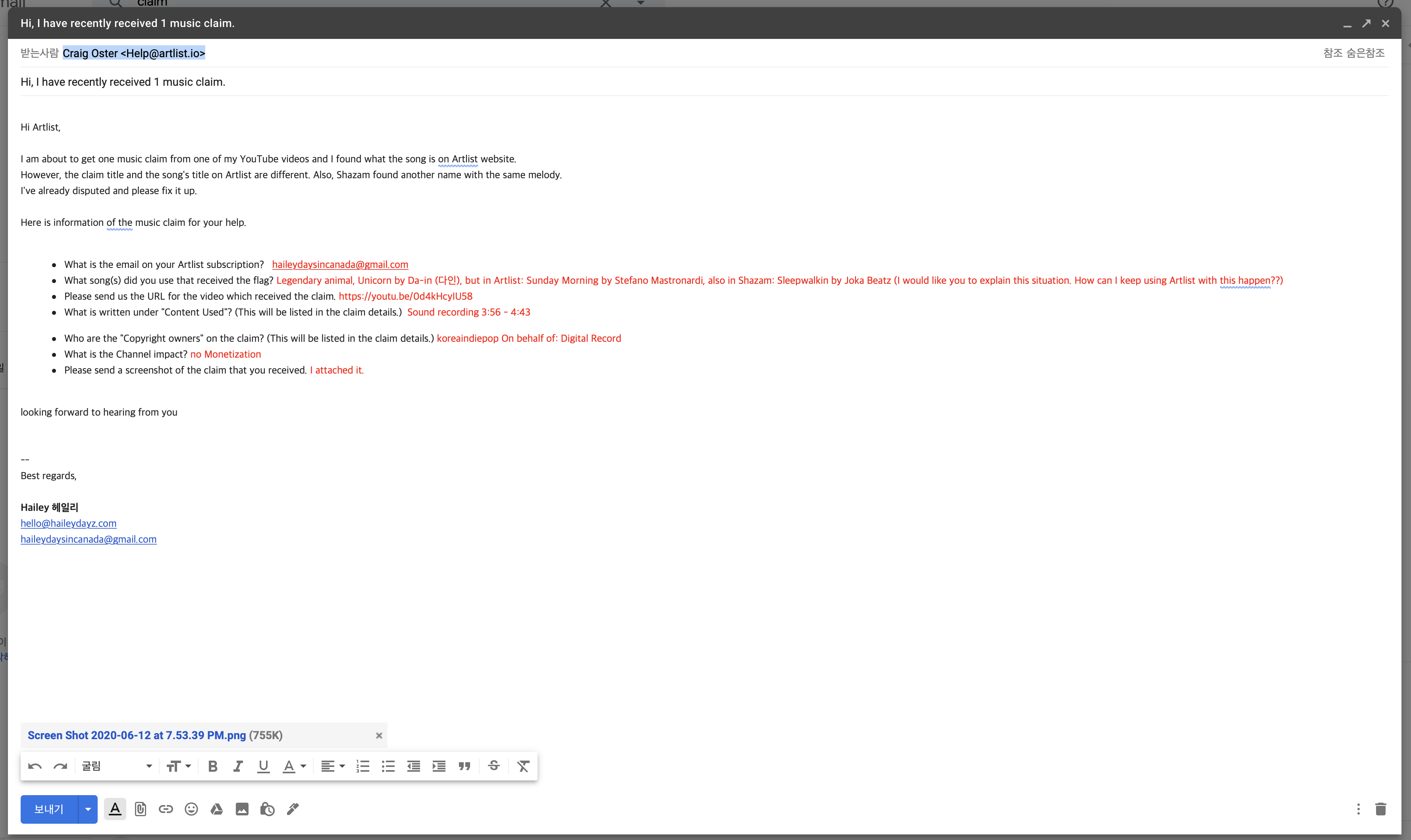 원래 예전같으면 노래제목이 기억이 안난다고 이메일을 보내는데, 이번에는 운이좋게도 제가 아트리스트 내에서 노래 제목을 찾았거든요. 근데 역시나 침해신고에 적힌 노래랑 다릅니다. 그래서 결론적으로는 아래와 같이 이메일을 보냈어요(영문법이나 단어는 틀릴 수 있으니 어떤지만 봐주세요).